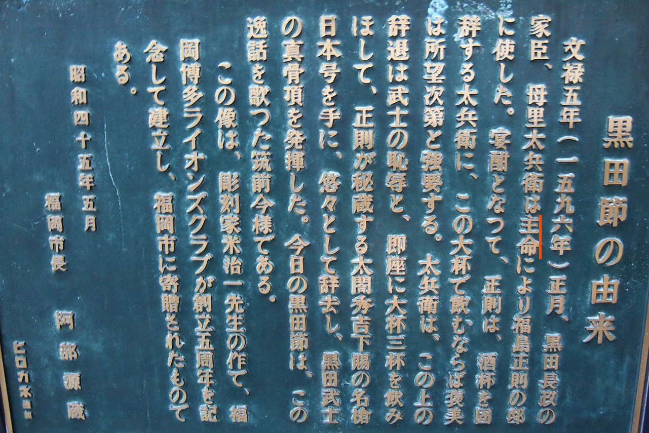 銅像の裏に書かれてる黒田節の由来に主命の二文字を発見。