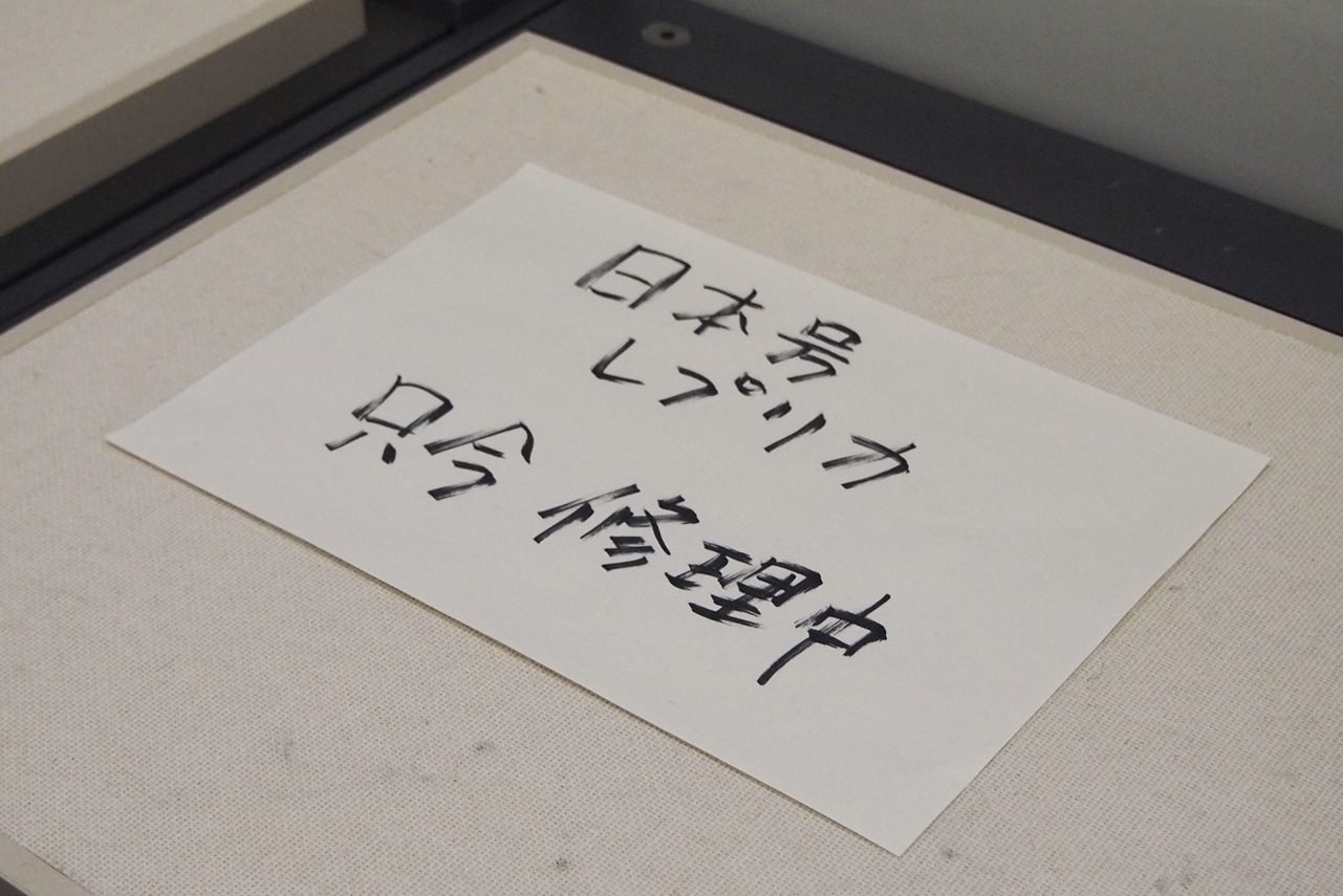 でも、この時20人ほどの(恐らく)審神者さん達と一緒に写真を撮っていたんですが、ふと横を見ると「日本号レプリカ只今修理中」の紙が…。