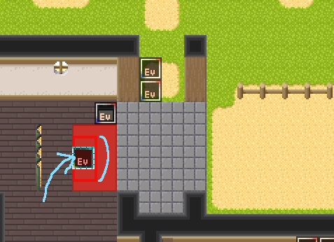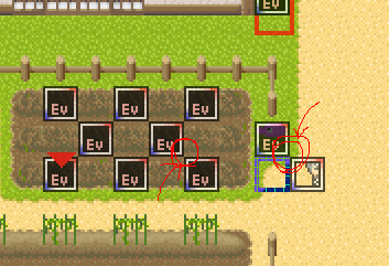それで、今、悩んでるのがこれ。イベントとイベントの角に審神者が立った時、決定を押すと、どっちのイベントも起動してしまうみたいです(報告ありがとうございます!)。畑の所の領域は狭めてみましたが、やっぱり角だとどっちも反応するなぁ。うーん、ゲーム進行的には問題なさそうなのでちょっと考えてみますね。