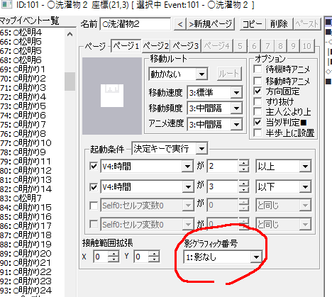 でも、このチップセットの切り替えをすると、何でか、影なしに設定しているのにも関わらず、いくつかマップイベントにキャラの影みたいのが出てきちゃうんですが、それがなんでか分からない…。何だろうこれ。