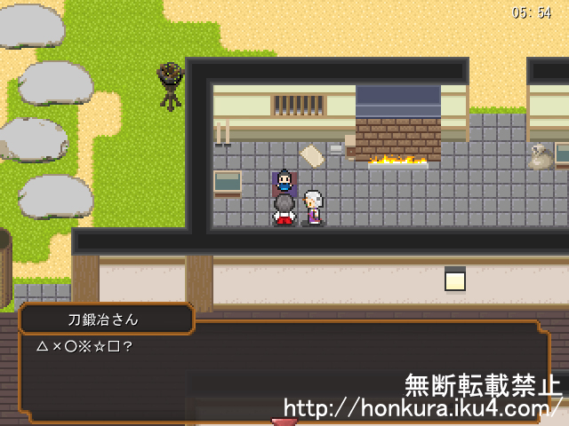 セリフチェックで祭がゲシュタルト崩壊しそうだったので、別の事しようと思って、キャラチップを作ったはいいけど実装してなかった刀鍛冶さんを設置しました。うちのゲームは鍛刀できない仕様ですが、話しかけるとよく分からない言葉で、ピロピロ返事をしてくれます。(村正を…どうか村正を…!)