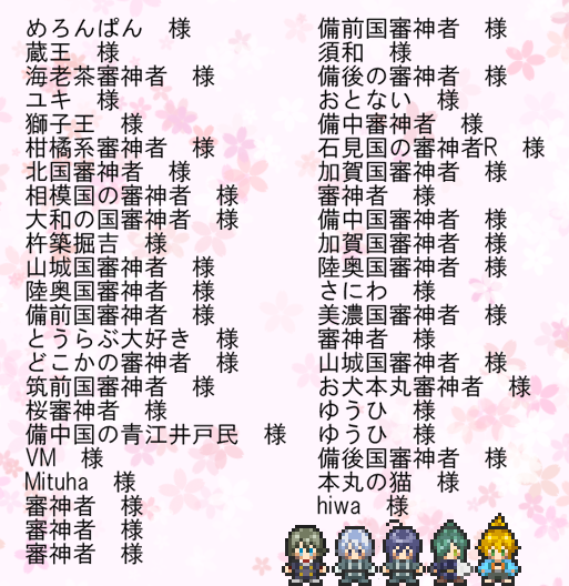 (こっそりイラストなんかも拝見させて頂いたりもしました。すんごいの。これ今回で初めて知ったけど、自分が作ったものから作品ができるのって嬉しくて堪らなくなんの)そして、バグ報告や要望も、凄く助かりました!皆さん、丁寧に報告下さって、忙しい制作者の事を気遣ってくれる人も多くて、本当、ありがとうございました!お借りしている素材の配布元様、コモンの制作者様、ふりーむ様も、大変、お世話になりました!